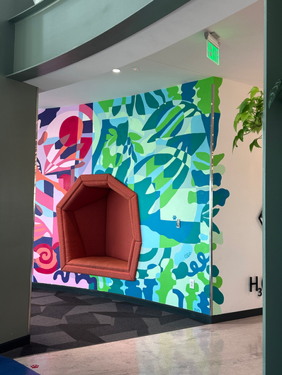 The DTLA Arts District contemporary space embraces the creative and interactive ambiance that is shaping the growing downtown LA community. In the AM Studio Sustainability mural below, the pops of yellow reflect the bright California sunbeams and buzzing energy of morning commuters crossing the 405. Bright blues and turquoise lay a sturdy foundation for the movement of the vast ocean that cradles the Los Angeles community. Dark green leaves pop, alongside a combination of bright lines, playful dark blue water scribbles, nature textures, and other washes of bright color. The emotional interpretation of space in a visual language lets subtle nuances of overlooked moments in time take root. While the installations key focus is sustainability, the building's wide variety of visitors - from industry executives, to design thinking practitioners, to engineers - create their own interpretation of the space. Make sure to stop by Accenture Arts District to see it for yourself.