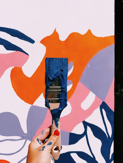 The morning began with a lot of pencil sketching ideas on paper, and later drawing the shapes in black and white onto the wall. These sketched images tend to be as simple as an outline of a shape, or simple directional arrows and edges. After the initial sketches, we brought the flowers to life using black spray paint and a combination or turquoise, and oranges, and purples paints. Throughout the project, it was hard to get a full view of the wall’s progress without exiting the patio area, and walking into the kitchen looking through the glass patio doors. Each flower was 3 times my body size with soft fading colors, drips, and texture. As I continued painting throughout the project, shadows from the sun and visions of nature became sources of interest for me, and I began to think about better ways to integrate the surrounding Westlake village elements into the piece. We also included a few secret little symbols that highlight elements of the client's personality and background. The highest value and fullfillment of these pieces lies in the energy we create with the space, the connections we establish with the community, and the legacy of relationships we foster with special clients along the way.